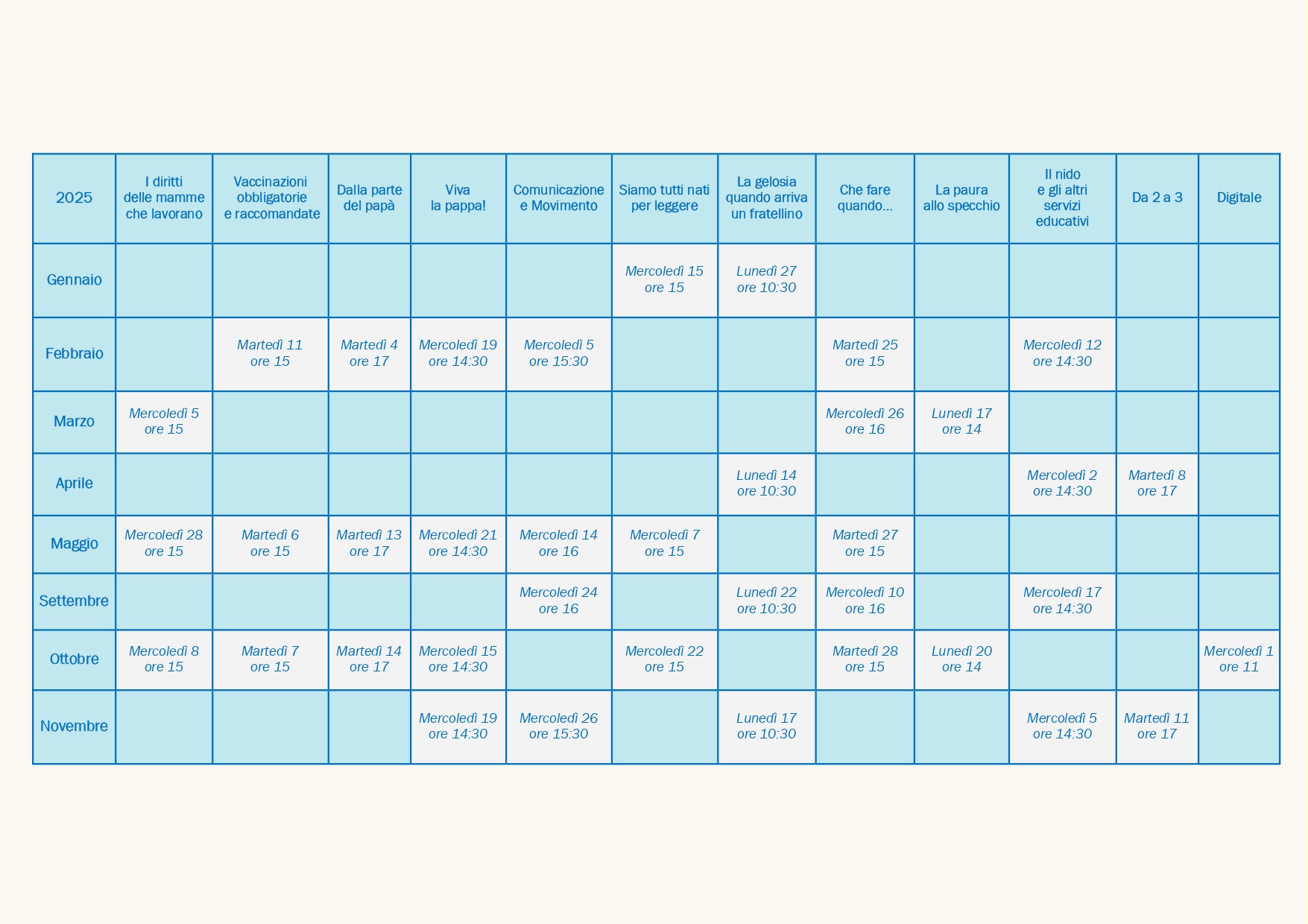 Spazio dedicato a mamme e bambini fino ai 12 mesi, per raccontarsi esperienze, dubbi, paure e domande. Accesso diretto, senza prenotazione