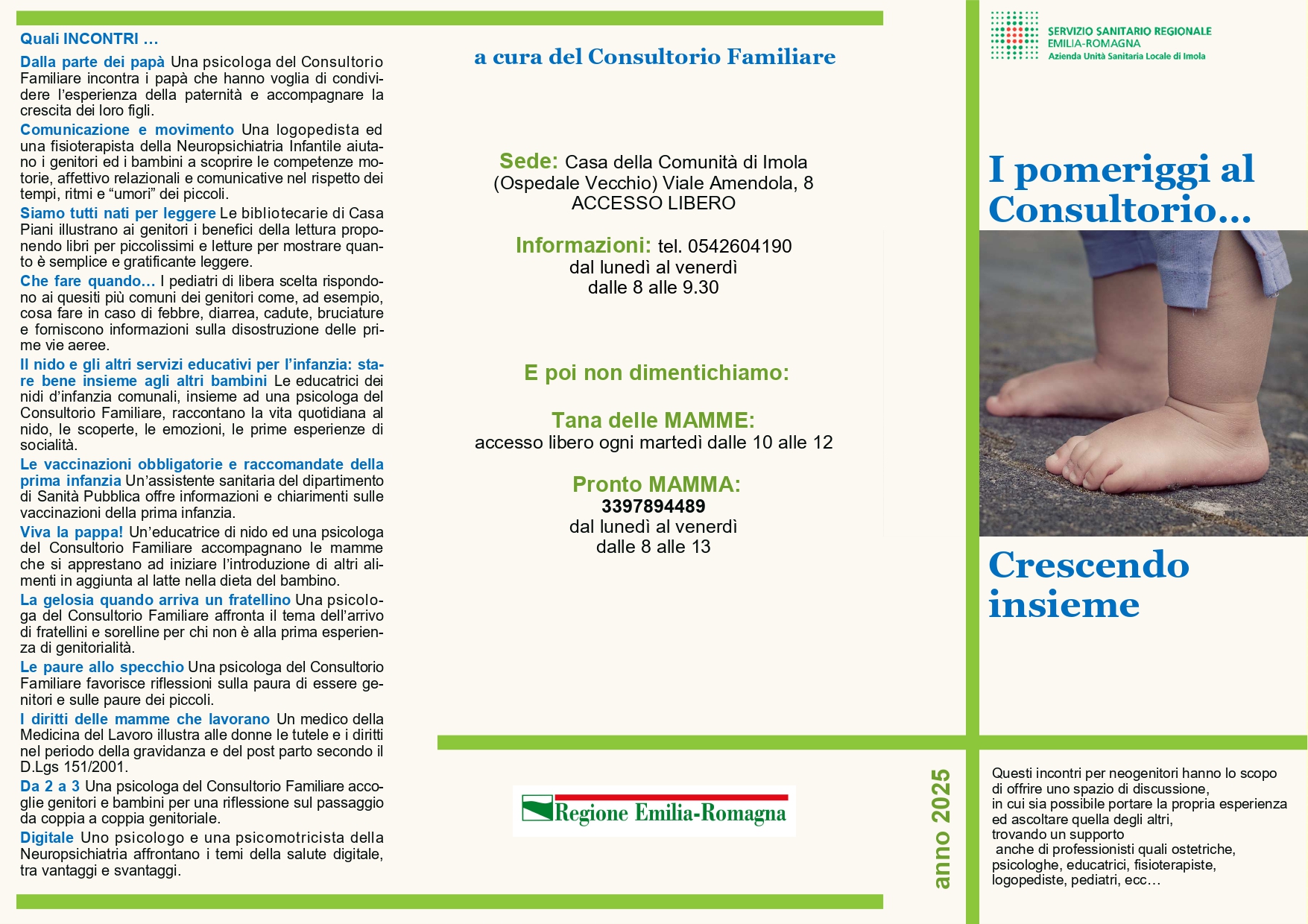 “I pomeriggi al consultorio…crescendo insieme”: nuovo anno e nuovi appuntamenti. Questi corsi progettati e organizzati dal Consultorio Familiare dell’Ausl Imola hanno l’obiettivo di sostenere accompagnare i genitori nelle delicate sfide che possono incontrare durante la gravidanza e l’infanzia.